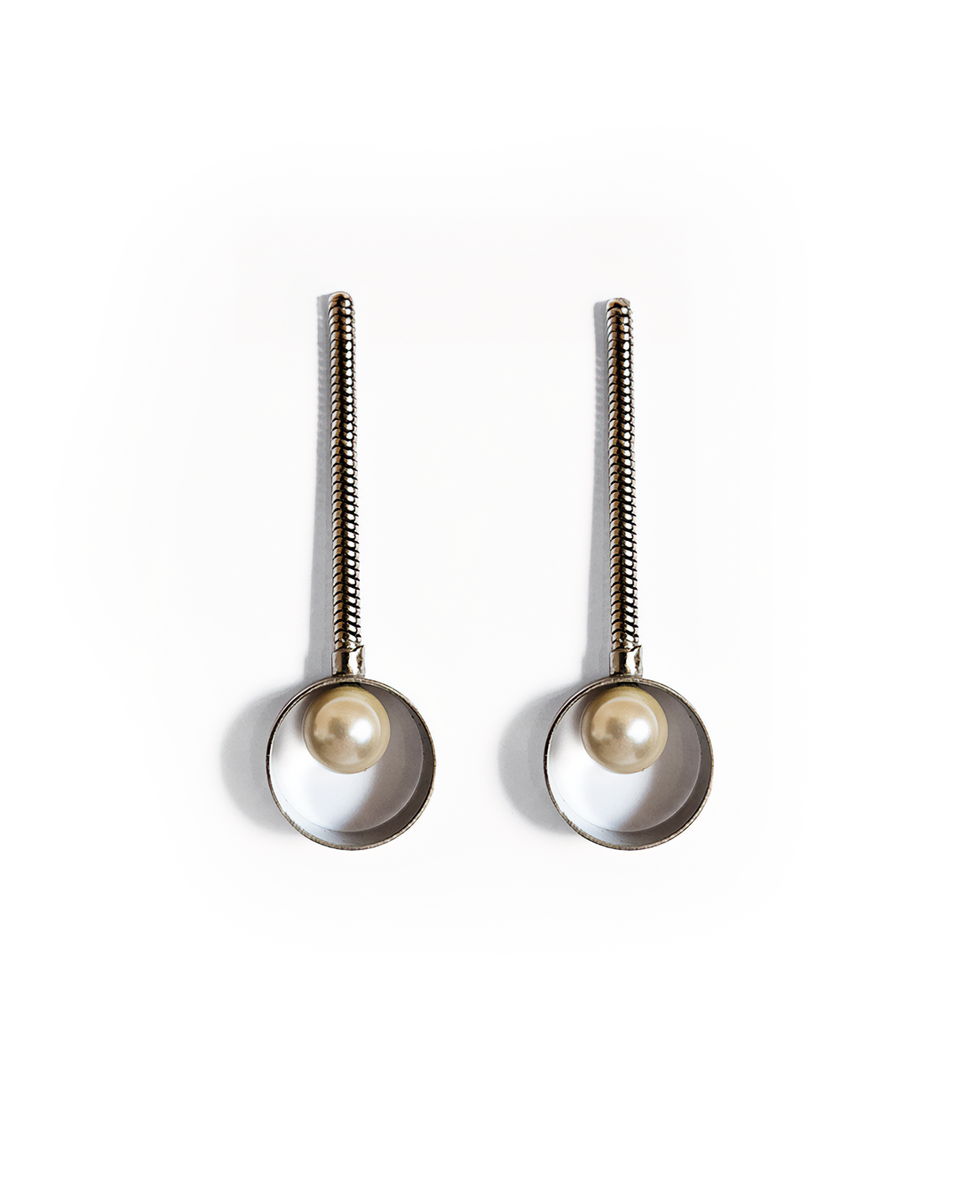 Brinco com corrente em metal, com pingente circular vazado em metal com pérola e banho prata envelhecido. O Brinco Aurora traz a tendência das pérolas em uma peça com design único e atemporal.