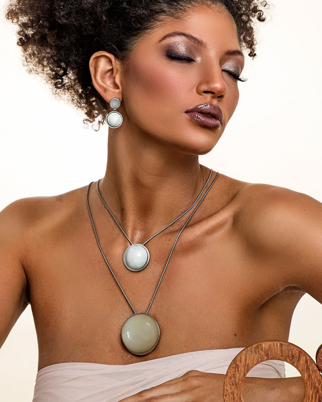 Colar corrente sobreposição pingentes em resina / prata envelhecido.